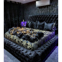 The Ambassador Upholstered Bed Frame in Black Crush Velvet is a bold statement piece designed to bring refined luxury and lasting comfort to modern UK bedrooms. Upholstered in premium crushed velvet, this bed frame features a full Chesterfield design with deep hand-pleated detailing, creating a striking focal point that suits both contemporary and minimalist interiors with a touch of elegance.
