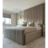 Ideal for those seeking a high headboard bed frame with a designer wall panel, this design offers strong visual impact and a refined, structured bedroom aesthetic without relying on storage or additional features.