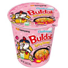 Samyang Hot Chicken Carbonara Ramen Cup 80G combines the famous Buldak spicy chicken flavour with a creamy Carbonara style sauce. The chewy noodles balance the heat with a rich, smooth taste, making this a popular option for those who enjoy spicy ramen with a milder finish.